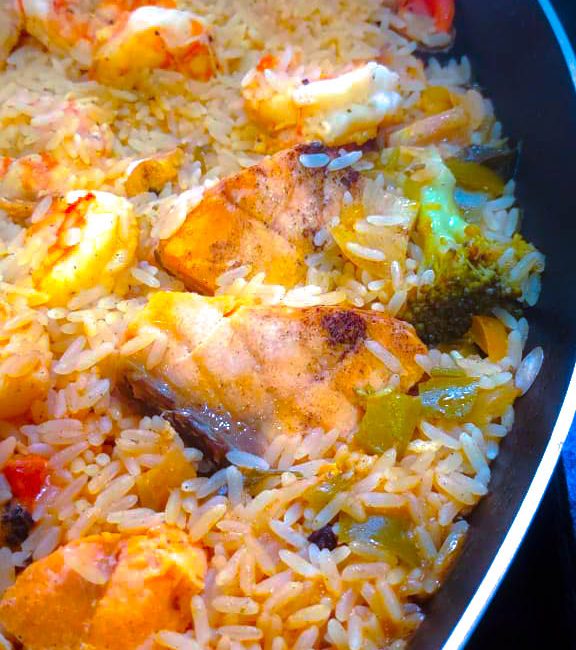 Coloque o salmão já cortado em pedaços na paellera de preferência para melhor cozimento.